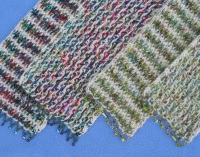 This is a delightful piece of knitting; the scarf is very easy to knit once you have familiarised yourself with the technique of double-knitting (a detailed description is included in the pattern). Larger-than-usual needles are used, allowing the yarn to go much further than expected; this makes it an ideal project for those odd balls of crazy yarn you just had to buy. WARNING: This pattern is addictive knitting: with the current explosion of exotic and fancy yarns, it is very difficult to stop after just one scarf!