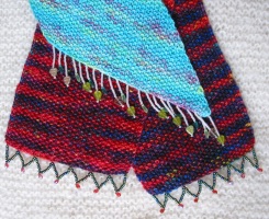Techniques: Beading between stitches, yarn-overs at beginning of rows, spliced yarn joins.