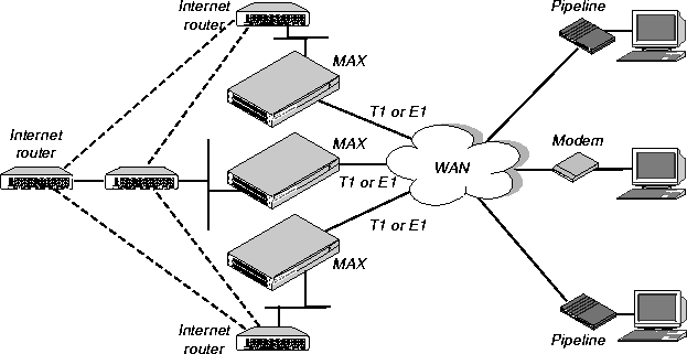 Typically, the MAX has T1 or E1 lines using ISDN signaling to connect to the WAN and handle the incoming switched connections. To connect to Internet routers, the MAX most often uses the local Ethernet, but it could also use serial WAN, nailed T1, nailed E1, or Frame Relay.
