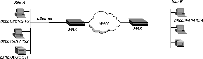 The MAX is a transparent bridge (also termed a learning bridge). It keeps track of where a particular address is located, and of the Connection profile that specifies the interface to which the packet should be forwarded. As it forwards a packet, the MAX logs the packet's source address and creates a bridge table that associates node addresses with a particular interface.