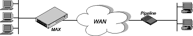 In this example, the local Ethernet supports NetWare clients, and the remote network supports both NetWare servers and clients, so the MAX requires IPX client bridging. When Handle IPX=Client, the MAX applies a data filter that discards RIP and SAP periodic broadcasts at its WAN interface, but forwards RIP and SAP queries. That way, local clients can locate a NetWare server across the WAN, but routine broadcasts do not keep the connection up unnecessarily.