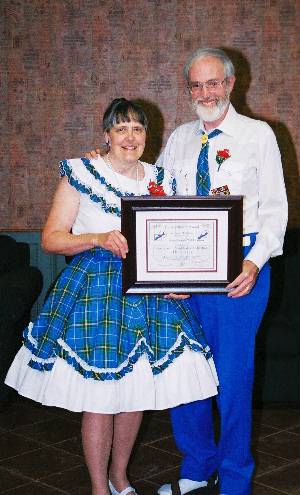 Burnley has always been at Shirley's side, making sure the dancers always had a cup of tea or coffee beforegoing home, and always filling in as a dancing partner for solo dancers. In 2004, due to health problems, Shirley wasunable to continue calling. We thank you for the many years of dedication. Awards were given to Shirley & Burnley inabsentia, at the Festival/05 in Yarmouth, which included, Service Award, Club Longevity and Dancer Longevity.
