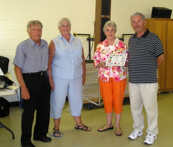On behalf of the Canadian Square and Round Dance Society, Wayne & Diane Burns, F2010 Chaircouple, presented a certificate to honor their 50th Wedding Anniversary. Jim & Pat are from Dartmouth, Nova Scotia where they have lived all their life. They have two children, four grandchildren and one great grandchild. Jim is retired from the Dartmouth Fire Department and Pat is still working as a school bus driver in Dartmouth. Jim & Pat are members of the Stardusters and are very active in their club and also in the Metro Association. Congratulations Jim & Pat and may you have many more happy years together.