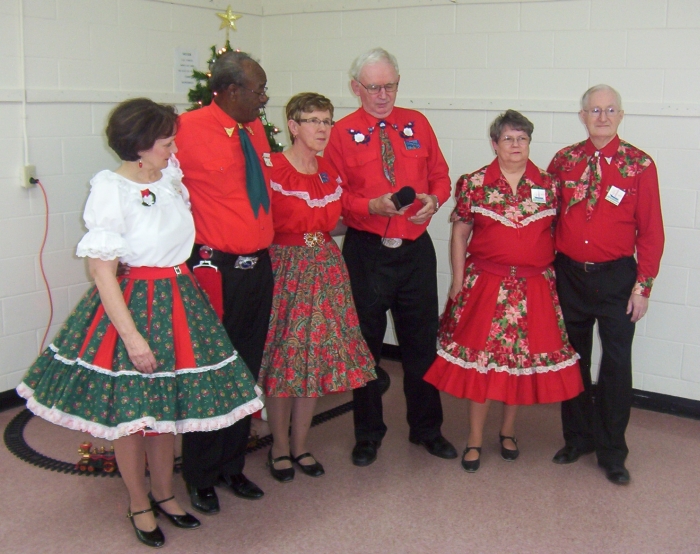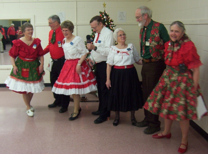 Three squares in full Christmas dress gathered at Bloomfield Centre on the morning of December 22 to dance in front of a CTV camera crew. Caller Dottie Welch put us through our paces, with a special teaching tip for good-natured host Cyril Lunney. Short introductory sessions were taped featuring four groups of six dancers. A "spokesperson" from each group was chosen to proclaim "Hi, I'm ----- and you're watching Morining Live on CTV!". The results were often hilarious, requiring one or more retakes. But all ended well, and the session aired the following morning to critical acclaim.