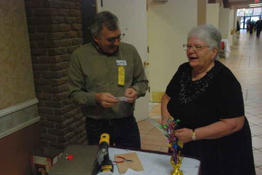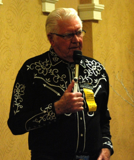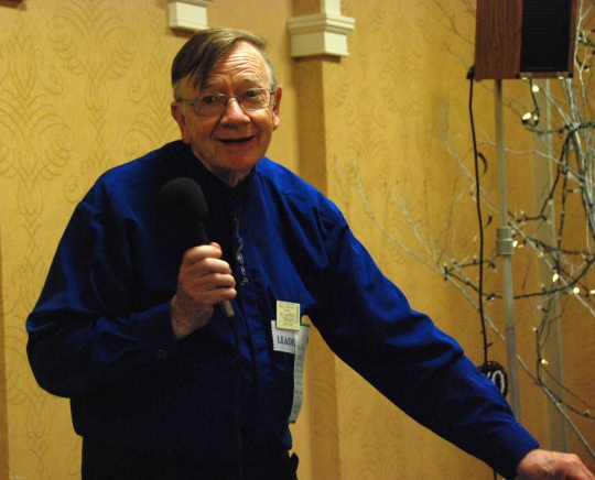 Jim DesBarres calling in front of the Mainstream Hall decorations