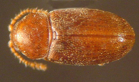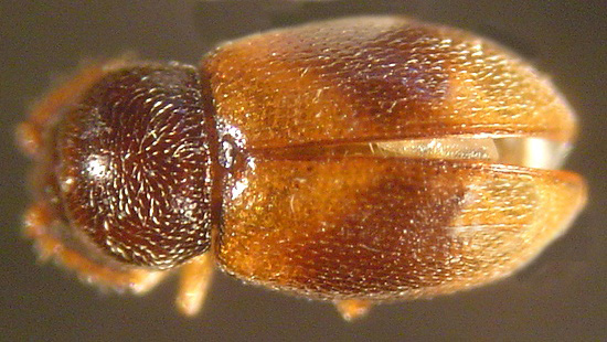 - 3(2) Elytra testaceus with a prominent piceus crossbar at the mid-point, either interrupted or continuous across suture; pronotum and prosternum piceous. 1.5-1.6 mm. ---- Atomaria ephippiata Zimmerman