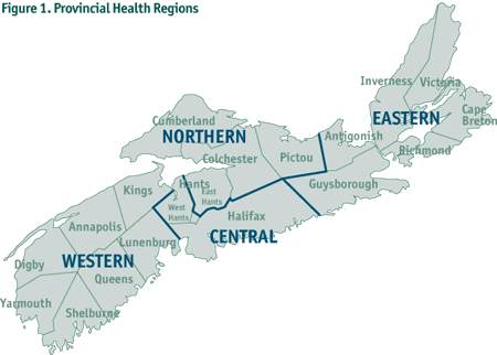 The sample of 5,578 people was drawn based on a probability sample designed by Statistics Canada and was representative of the Nova Scotian population by age and sex. The sample consisted of non-institutionalized Nova Scotians age 18 and over whose names were listed in the provincial medical insurance register [4]. All active military personnel, RCMP, and those living on native reserves are not included on the MSI register and, therefore, were not part of the sample. The population was divided by regions (Northern, Western, Central, and Eastern) which were chosen to correspond as closely as possible to the new provincial health regions (Figure 1). These regional groups were then classified by sex (male or female) and by seven age groups [5]. For ease of comparison and statistical analysis, these seven age groups were then collapsed into three groups for presentation in the report (18-34, 35-64, 65+ years). Exceptions are the data on smoking as well as a portion of the data on alcohol, where age groups were not combined in order to present detailed findings on specific younger age categories.