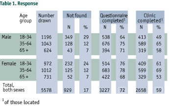 A group of 29 public health nurses took part in a six-day training session to learn the techniques for contacting respondents and collecting data. Data were collected from March through November 1995. Potential survey respondents were sent an introductory letter explaining the survey, and they were then contacted by a public health nurse. Those who agreed to participate were interviewed by the nurses and were assured that their information would remain confidential. The survey questionnaire was a compilation of valid and reliable instruments and consisted of 56 pages, requiring, on average, 1.5 hours to complete. The survey questions were read aloud by the nurses, who then recorded the respondent's answers, and collected two blood pressure readings: one at the beginning and another at the end of the interview. Respondents who completed the interview were asked to attend a clinic session where blood pressure, weight, height, and waist and hip measurements were recorded and a blood sample was drawn for blood cholesterol measurement. During the clinic visit, respondents were asked to take part in a structured videotaped interview to assess behaviour patterns associated with cardiovascular disease (CVD) [6] risk. Results of the structured interviews will be presented in a future report. Completed questionnaires, clinic data sheets, and videotapes were forwarded to the central collection site for data entry, quality assessment, and statistical analysis.