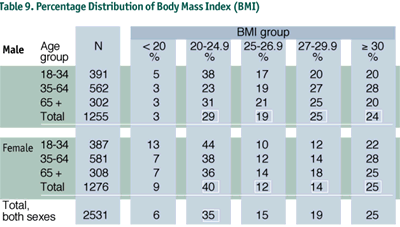To assess the weight status of Nova Scotian adults, Body Mass Index (BMI) [9] was calculated from weights and heights measured during the clinic visit. Figure 2 presents standard BMI values associated with certain levels of health risk.