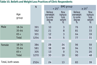 When asked whether they saw themselves as overweight most respondents with a BMI over 25 believed that they were overweight (Table 10). However, only 39% of this group were trying to lose weight, with more women (48%) than men (31%) attempting weight change. Men and women over age 65 who were overweight were less likely to be attempting weight loss than their younger counterparts. Finally, a percentage of men and women with BMI values less than 25 (indicating a weight that is healthy or low) believed that they were overweight (14% of men and 30% of women). Of concern are the 24% of women 18- 34 years old and 18% of women 35-64 years old with a BMI <25 who reported trying to lose weight.
