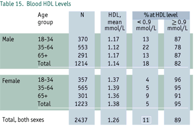 HDL cholesterol levels did not appear to change with age (Table 15). Under age 65, a greater percentage of women had HDL levels > 0.9 mmol/L, indicating a healthier value compared to men, yet over age 65, there was no statistical difference between men and women on this measure. Eleven percent of the population was at risk from low HDL cholesterol (< 0.9 mmol/L), with men of all ages showing greater risk than women.