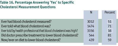 Approximately one-half of the population (51%) reported having had their cholesterol level checked and 16% reported being told by a health professional that it was high. Of these, the majority had been prescribed treatment by a physician and/or had been on a diet (now or in the past) to lower their blood cholesterol levels (Table 16).