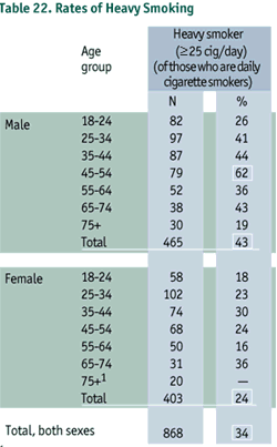 One-third of Nova Scotians were smokers. Overall, more men than women were daily (1 or more cigarettes/day) and heavy smokers (25 or more cigarettes/day) (p < 0.05). Twenty-nine percent of adults were daily smokers, and the highest prevalence for both sexes appears to be in the 25-44 age range (Table 21). Of the daily smokers, 34% were heavy smokers and the greatest percent were men age 45-54 (Table 22)