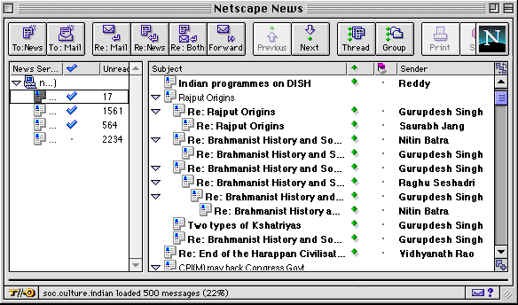 For instance in the example above (from the group soc.culture.indian) you can see a series of messages in a thread called Rajiput origins followed by a new thread called Brahminist History and Society. Just like in Email when you see the contraction Re: this means that this is a Reply to a previous message.