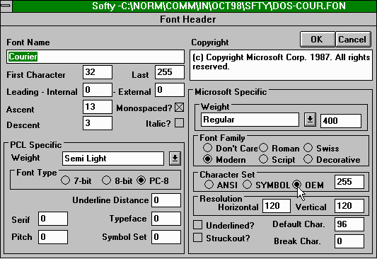 - change font headers to redefine ANSI (Windows) fonts to OEM (PC) fonts